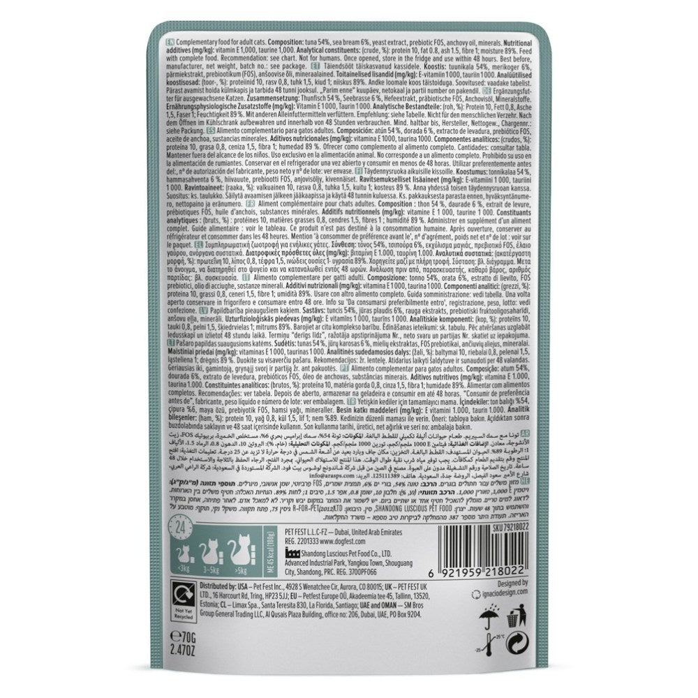 Composition: tuna 58%, yeast extract, prebiotic FOS, anchovy oil, minerals.