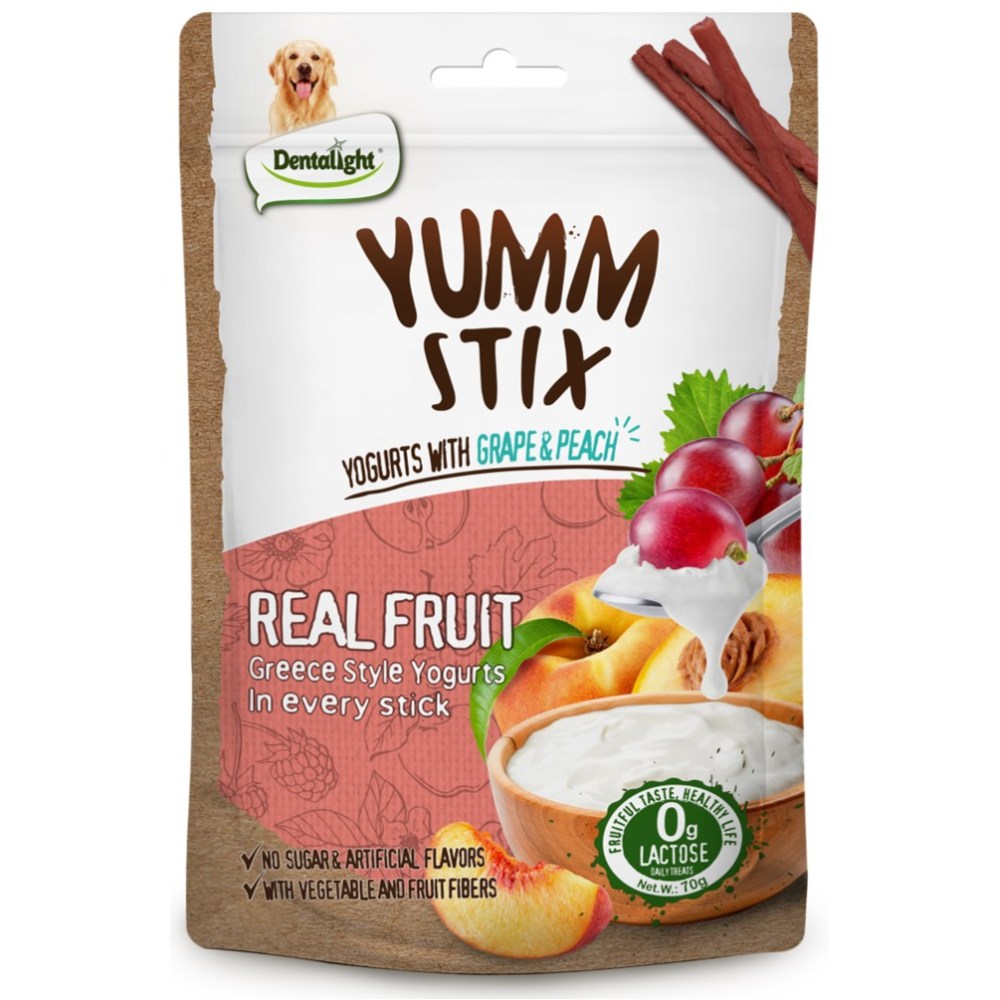 Dentalight Yumm Stix Wet & Soft, Yoghurts with Grape & Peach are crafted with real Tuna as the primary ingredient, and are free from corn, wheat, artificial flavors, and colorants.