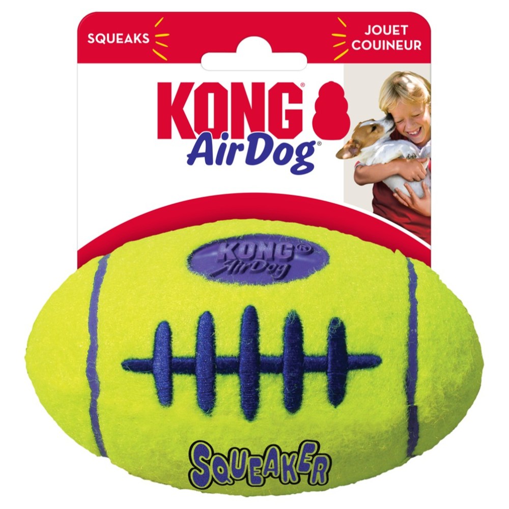 KONG AirDog® Squeaker Football combines two classic dog toys -the tennis ball and the squeaker – to create the perfect fetch toy. The non-abrasive, high-quality material will not wear down dogs’ teeth. Find your dog’s favorite AirDog® shape and let the games begin.