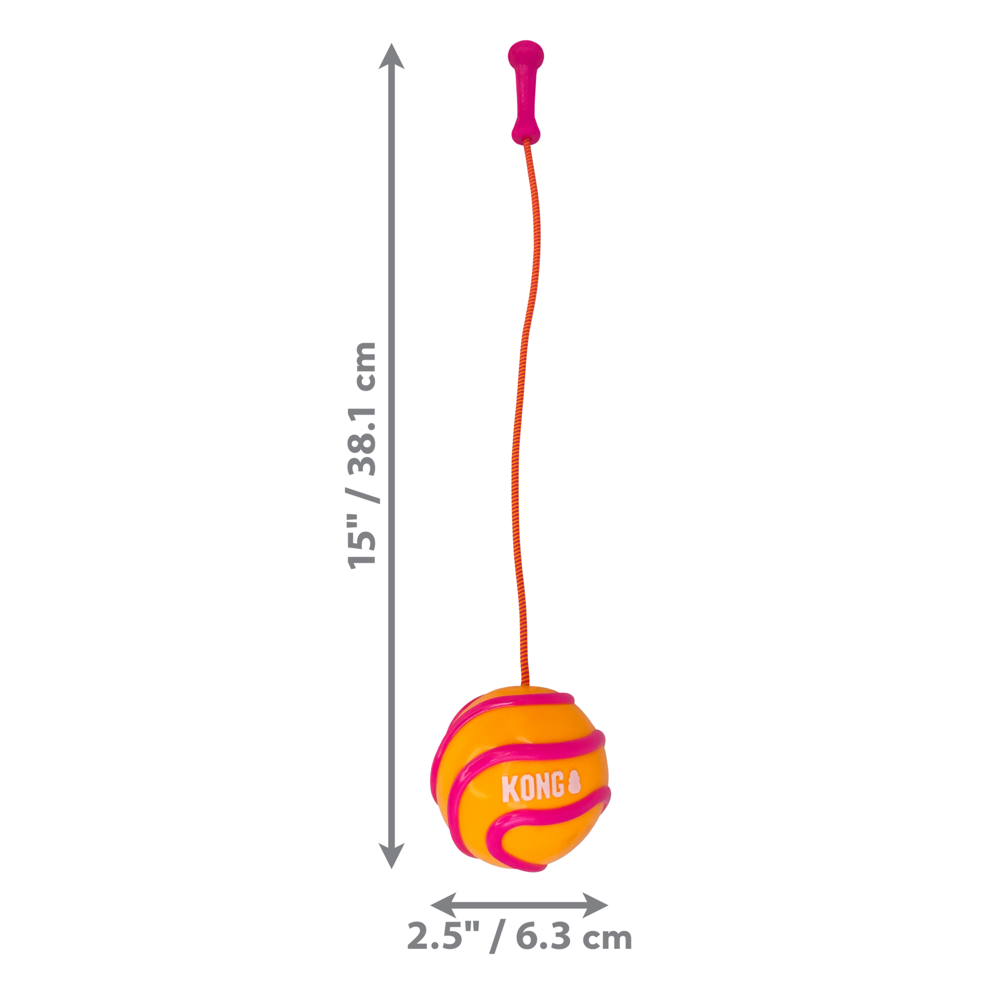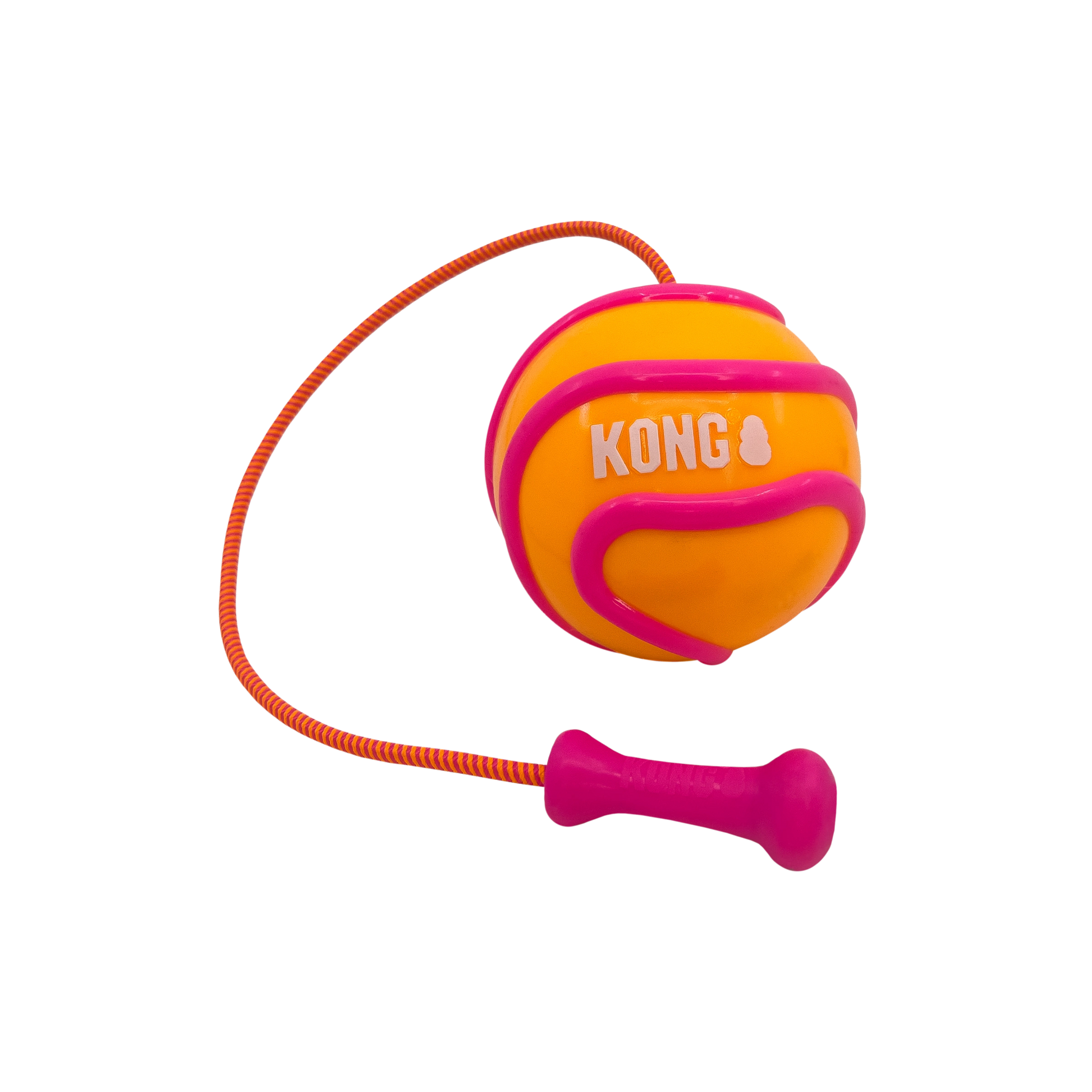 KONG Bunji High-Viz Ball with bright colors and glowing technology makes for easy spotting in various environments, night or day. This shoulder-saving ball with bungee cord effortlessly launches for long-distance fetch-and-retrieve sessions. Floats in water for water sports. Charge the ball & handle under a lamp or in the sun for 15-20 minutes to activate glow-in-the-dark feature.