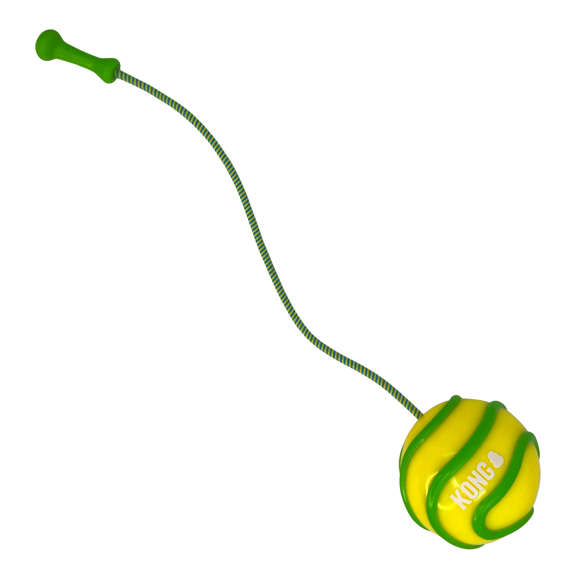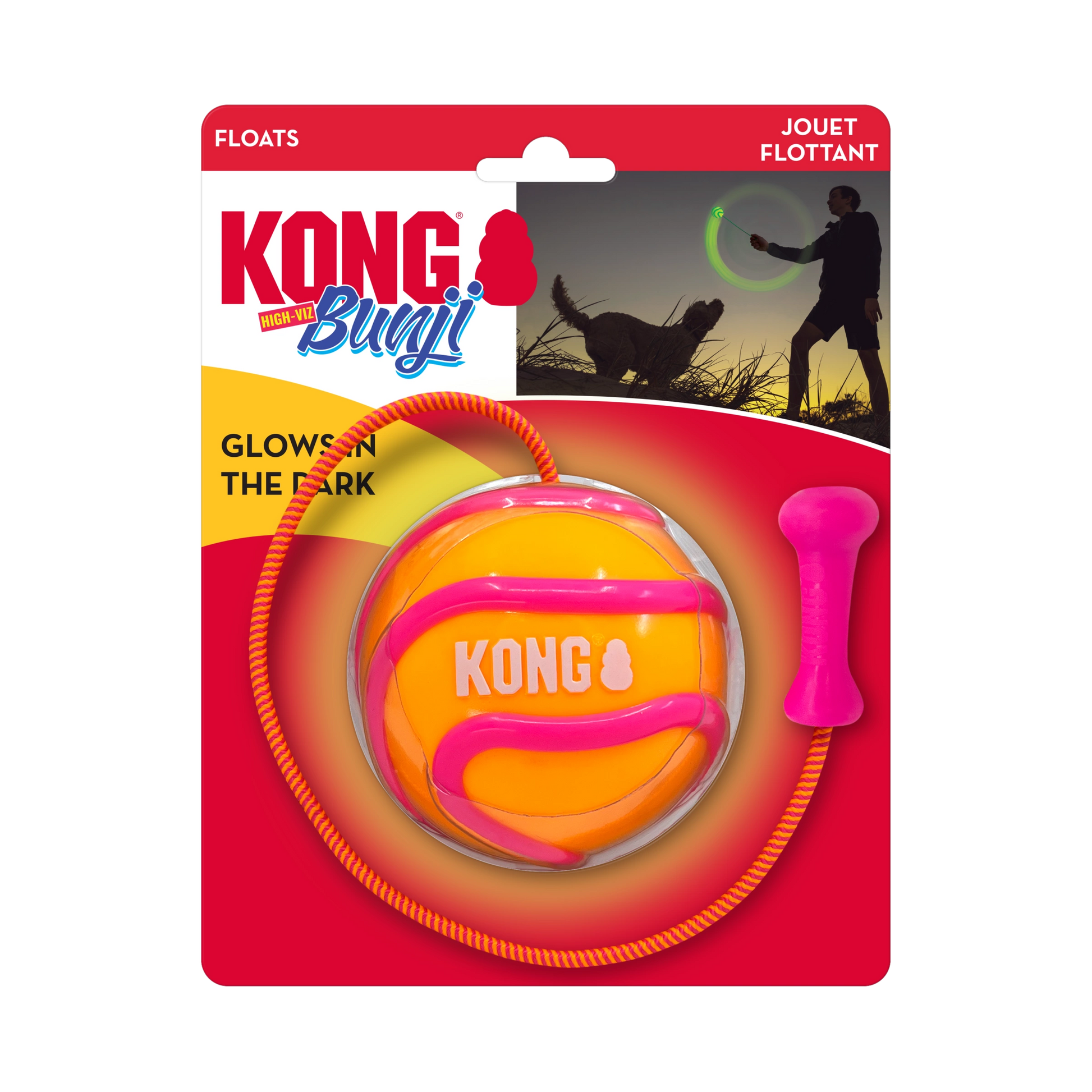 The KONG Bunji High-Viz Ball is specially designed with bright, high visibility colors for various environments, weather, and terrain. Ideal for fetch-and-retrieve play, this durable ball has raised ridges that create an unpredictable bounce, and an ergonomic bungee cord rope that effortlessly launches long distance, saving your shoulder from burnout! Glow-in-the-dark ball and handle make this toy perfect for playing after the sun goes down and on gloomy days—and it even floats in water! Charge the ball & handle under a lamp or in the sun for 15-20 minutes to activate glow-in-the-dark feature.