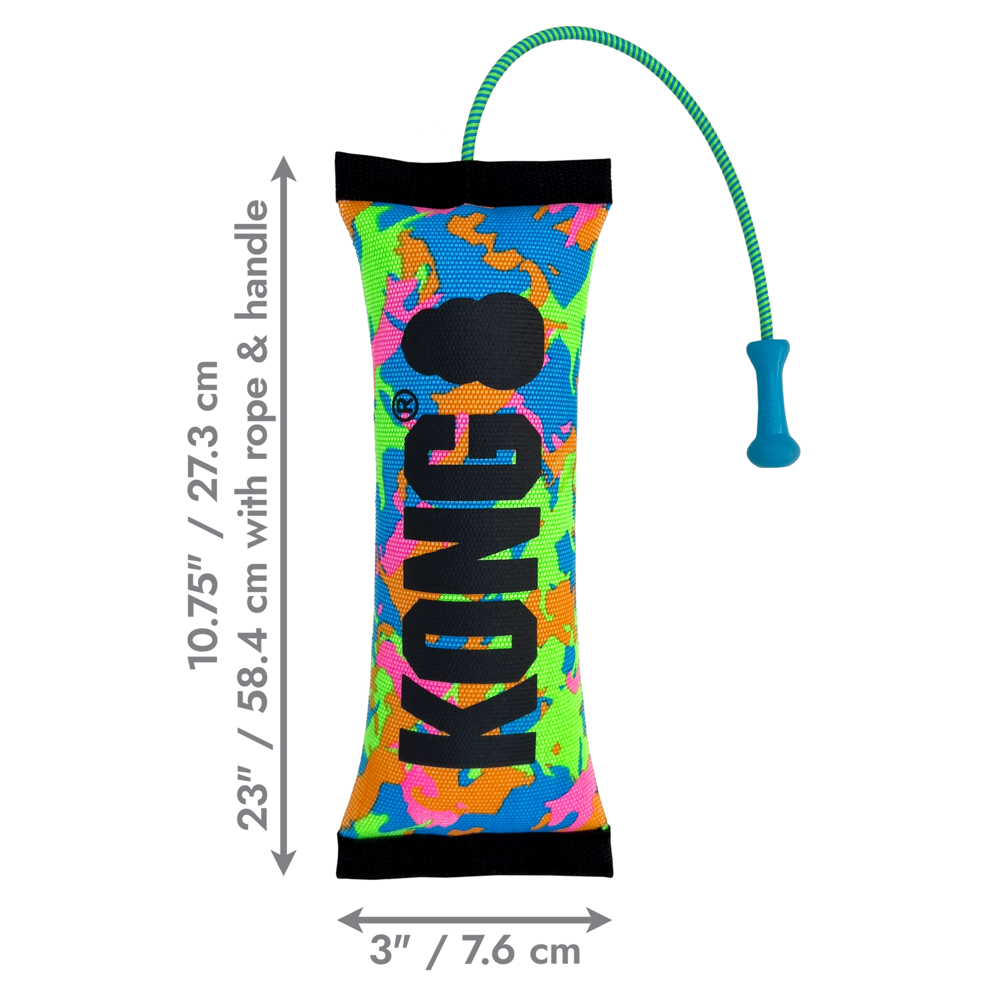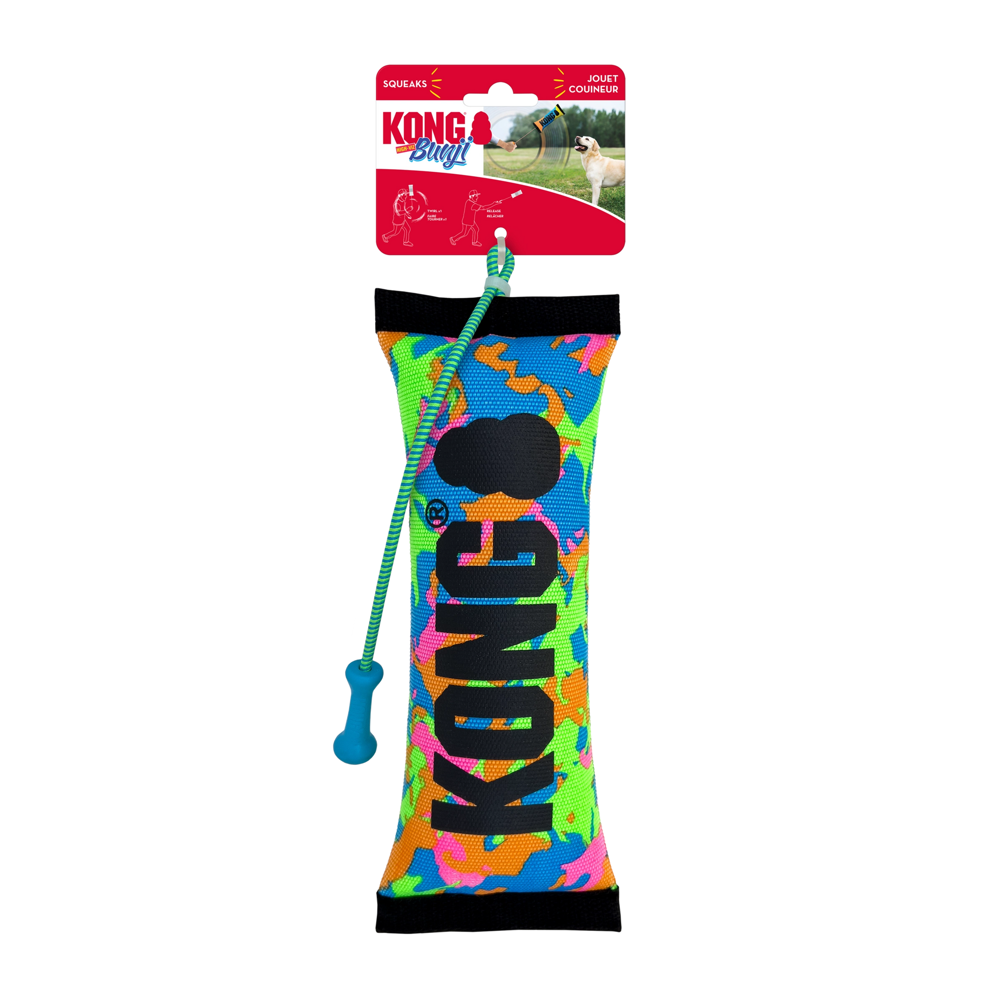 KONG Bunji High-Viz Bumper with bright colors and patterns makes for easy spotting in various environments. This shoulder-saving, heavy duty bumper and rope effortlessly launches for long-distance fetch-and-retrieve sessions, while the squeaker engages natural instincts for extended play sessions.