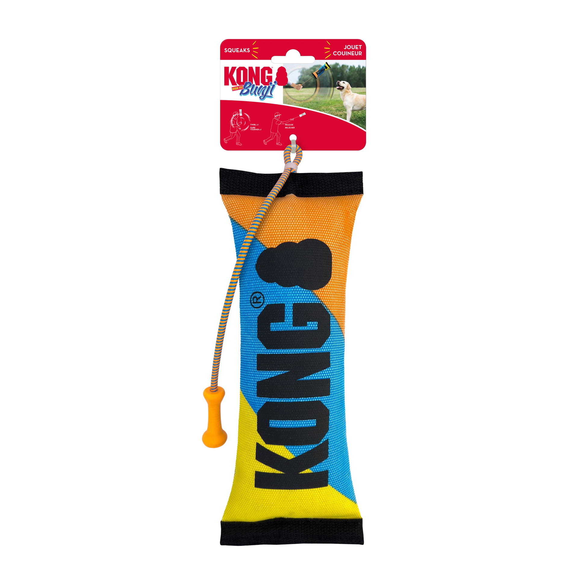 - KONG Bunji High-Viz Bumper with bright colors and patterns makes for easy spotting in various environments. This shoulder-saving, heavy duty bumper and rope effortlessly launches for long-distance fetch-and-retrieve sessions, while the squeaker engages natural instincts for extended play sessions.