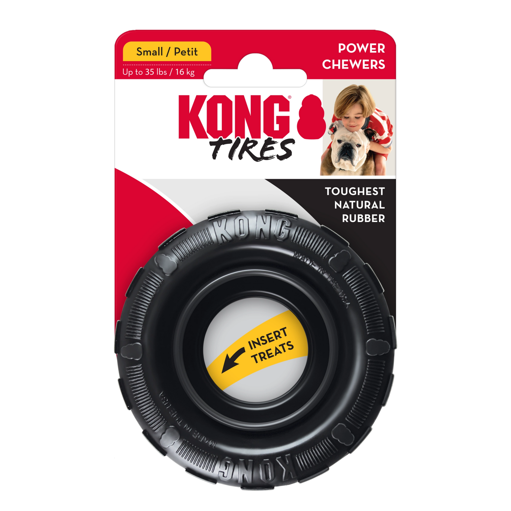 KONG Tires is a durable tire chew designed to provide the ultimate chewing experience. The uniquely shaped sidewalls and thick outer tread create a super durable, elastic barrier. The sidewalls are designed to double up and rebound when compressed to provide an active chewing experience, and the Tires are perfect for bouncy games of fetch.