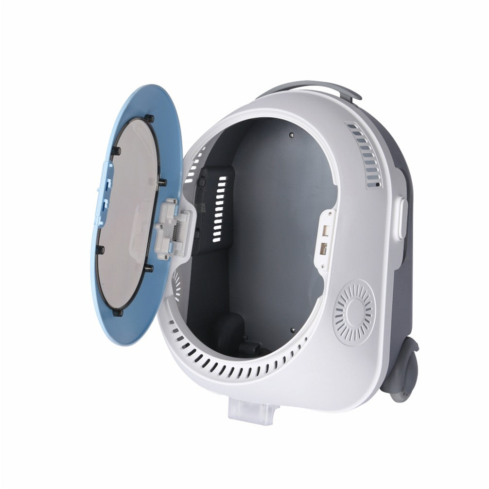 The night lighting feature requires a power bank (not included), with a recommended size of 15 x 8 x 2.5 cm. The backpack is equipped with two silent wheels for smooth maneuverability and can be used as both a backpack and a pet carrier trolley, thanks to its adjustable telescopic rod.