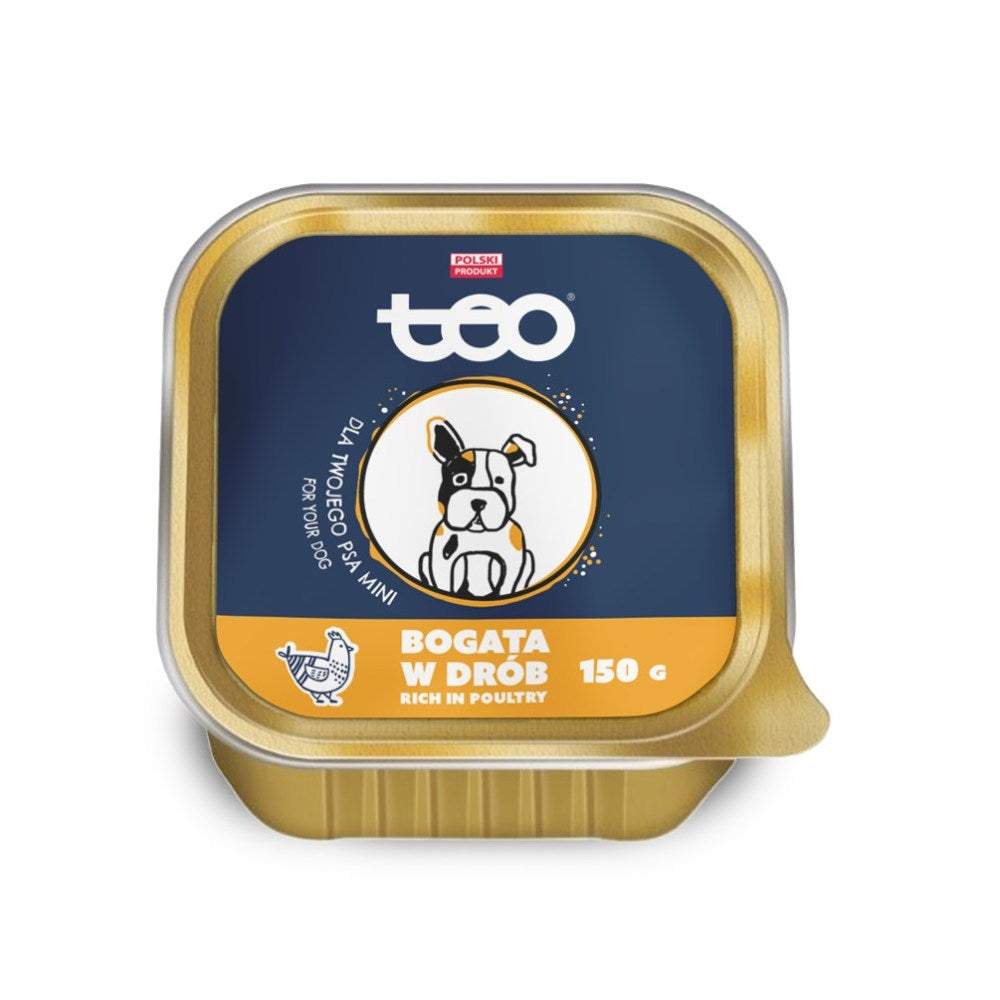 Thanks to the carefully selected production process and the use of low-temperature technology, it was possible to preserve all the nutrients and taste of the meat. TEO wet dog food is characterized by a high content of meat, which has been additionally enriched with a mineral and vitamin complex that ensures the proper condition of the dog. Thanks to this, the pet stays healthy for many years. Alupac, is a convenient form of serving a meal, because its amount is usually an ideal portion for an adult dog, thanks to which there are no leftovers left after the meal, which are stored and lose their best properties.